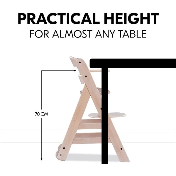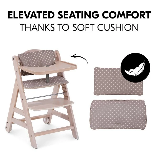 Für Sicherheit sorgen der 5-Punkt-Gurt und der Schrittgurt, welche mit dem anderen Zubehör kompatibel sind. Auf dem großzügigen Holztisch hat dein Kind individuellen Freiraum zum Essen und Spielen. Alternativ kannst du den Tisch gegen den Vorderbügel austauschen und den Stuhl unter fast jeden Tisch schieben. Die im Set enthaltene Hochstuhlauflage besteht aus einem weichen Kissen für Rückenlehne und Sitz, welche deinem Kind erhöhten Sitzkomfort beim Essen und Spielen bieten.