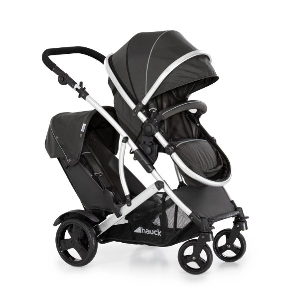 Mit den gepolsterten 5-Punkt-Gurtsystemen, dem Schutzbügel sowie einer auf die Hinterräder wirkenden Bremse sind die Kleinen immer sicher unterwegs. Bei schlechtem Wetter bieten die zwei Regenverdecke, die im Lieferumfang enthalten sind, Schutz vor der Nässe. Die Babyutensilien werden im Einkaufskorb verstaut. Für den Transport lässt sich der Geschwisterkinderwagen auf ein kompaktes Faltmaß zusammenklappen.