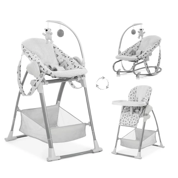 Diese Hochstuhlkombination ist ein echtes Multitalent. Das höhenverstellbare Gestell kann sowohl mit dem kuscheligen Neugeborenen-Aufsatz als auch mit dem Kinder-Aufsatz kombiniert werden. Ein Wippengestell ist ebenfalls inklusive. Der kippsichere Sit N Relax 3in1 lässt sich einfach zusammenklappen und dank der Rollen leicht hin und her schieben.